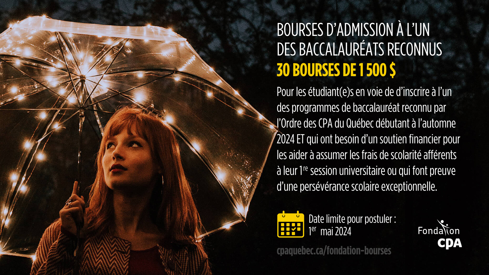 Le concours pour le programme de bourses d’admission à l’un des baccalauréats reconnus 2024-2025 de la Fondation des CPA est présentement en vigueur.