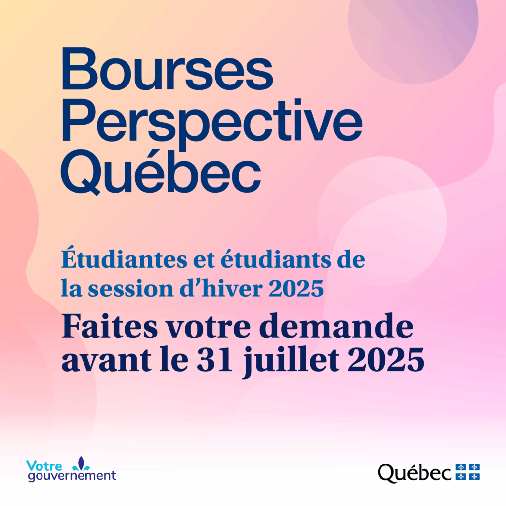 Les personnes étudiantes admissibles aux Bourses Perspective Québec pourront présenter leur demande pour la session d’hiver 2025 dès jeudi prochain, le 1er mai 2025 ; elles auront jusqu’au 31 juillet 2025 pour la remplir.