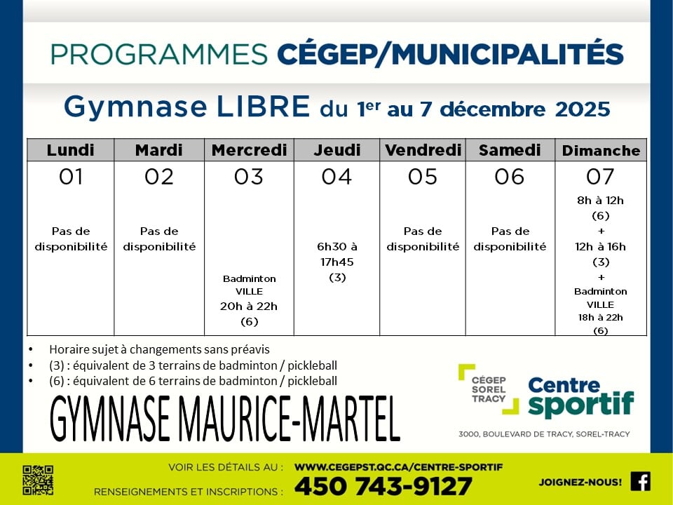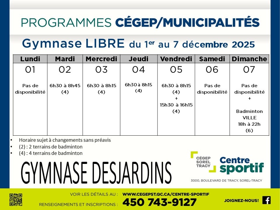 Le Cégep de Sorel-Tracy, par son Centre sportif, offre depuis plus de 30 ans des services en matière de saines habitudes de vie, tant à ses étudiants qu’à la communauté. Le Centre sportif s’assure ainsi, par la mise en place de toutes sortes d’activités offertes pour tous les âges, de collaborer à la santé de la population de la région.